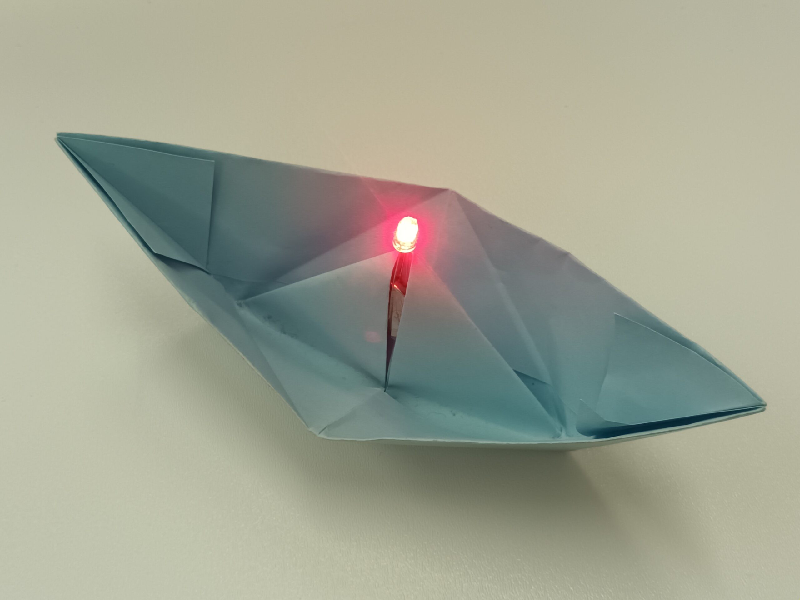 Složená papírová loďka je vizuálně vylepšena blikající LED diodou a vyzkoušena na vodě.