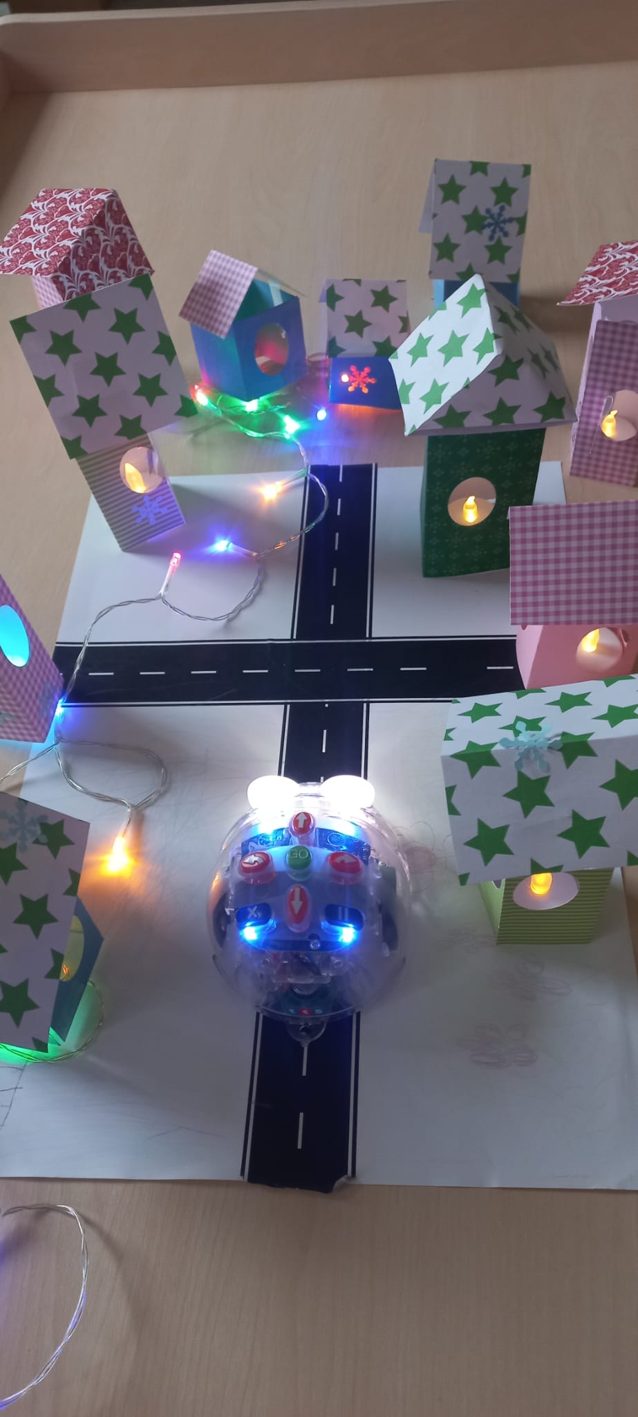 Děti vyrábějí svítící adventní městečko, zpívají písničky a programují Bee-Boty ve svém městečku.