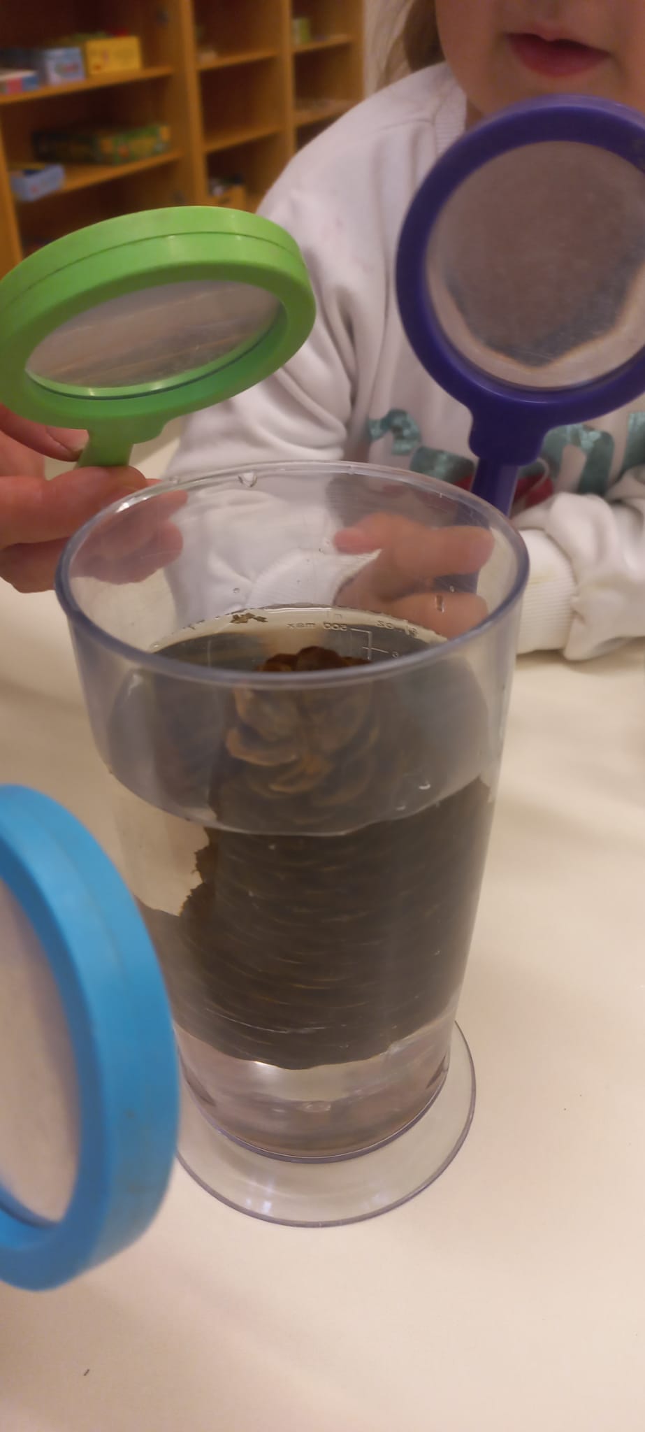 Děti zmrazily vodu s přírodními materiály a zkoumaly led pomocí lupy na tabletu.